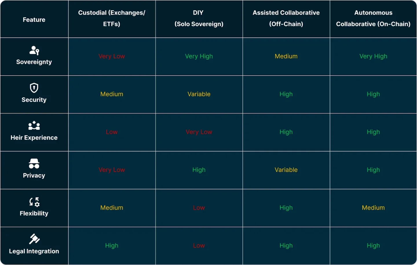 On-chain collaborative solutions often excel in durability: the fallback path is designed to work even if the service provider fails, which is crucial for inheritance plans that need to remain effective for decades.