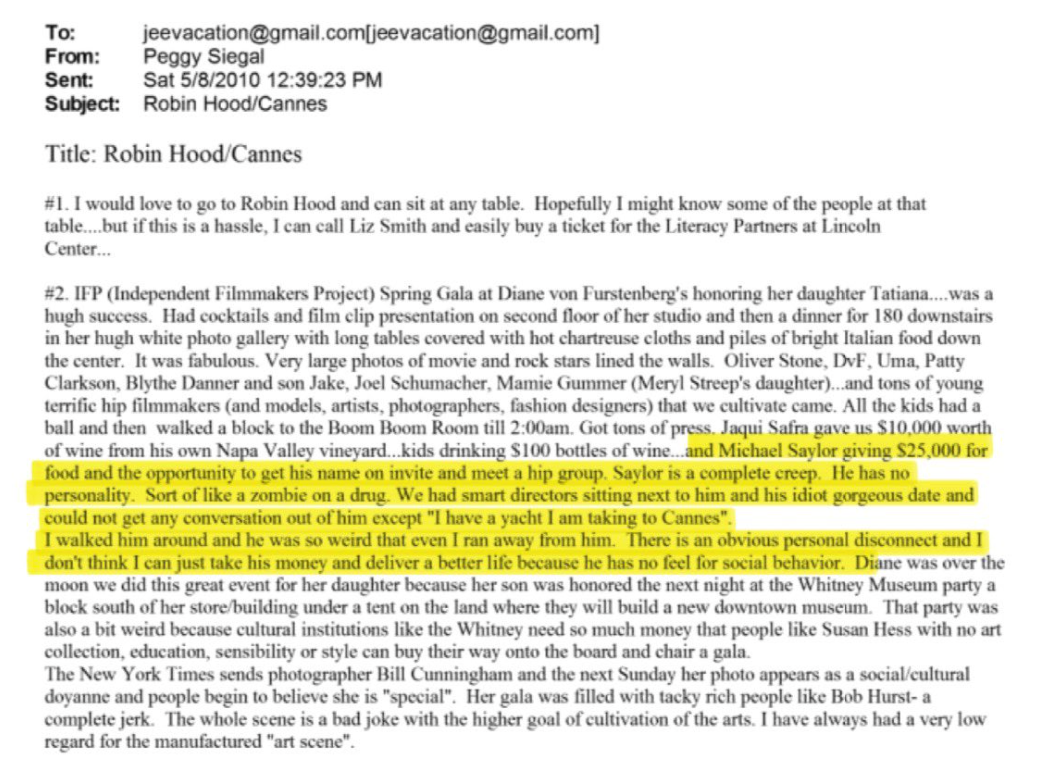 From the currently disclosed information, in 2010, Epstein's publicist Peggy Siegal once complained in a private email: