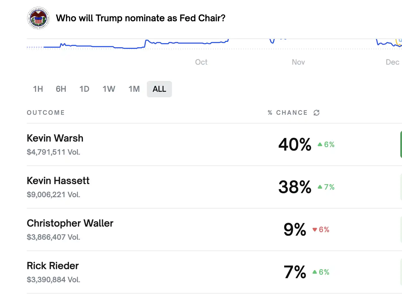 As of writing, Polymarket data shows the probability of Kevin Warsh becoming Fed Chair is temporarily at 40% (up 6%), Kevin Hassett at 38% (up 7%), Christopher Waller at 9% (down 9%), and Rick Rieder has the lowest probability at 7% (up 6%). Although his odds are lower compared to Warsh and Hassett, the 6-point increase means he's soon to overtake Waller.