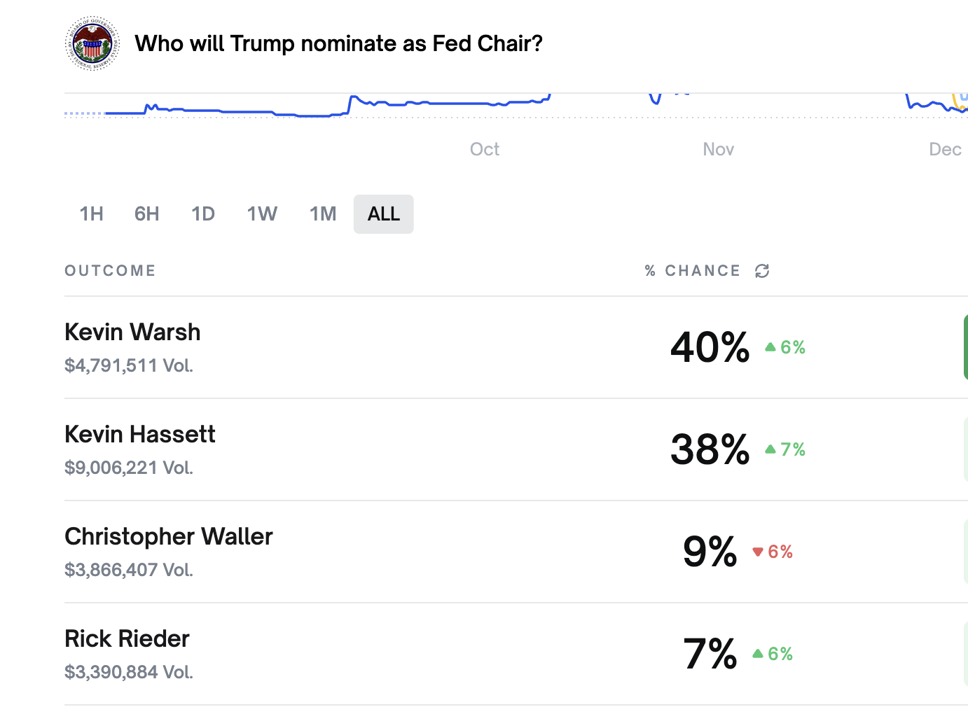 As of writing, Polymarket data shows the probability of Kevin Warsh being elected Fed Chair is temporarily at 40% (up 6%), Kevin Hassett at 38% (up 7%), Christopher Waller at 9% (down 9%), and Rick Rieder has the lowest probability, temporarily at 7% (up 6%). Although his chances are lower compared to Warsh and Hassett, at least it increased by 6 points, soon surpassing Waller.