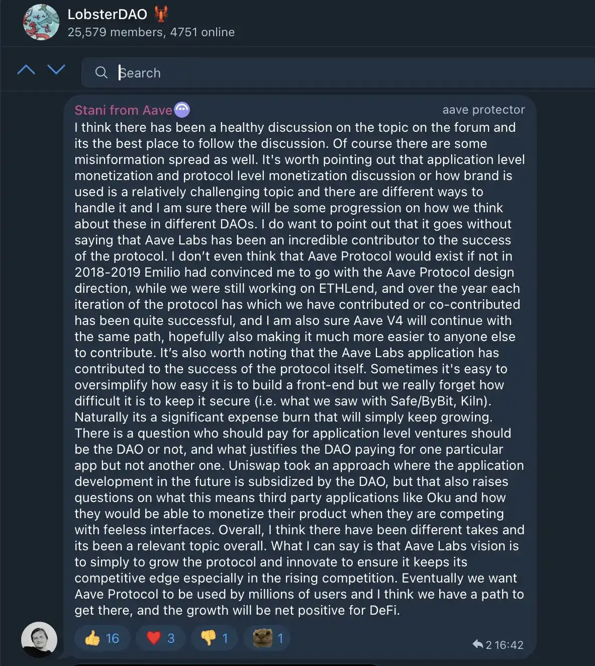 Pero desde la perspectiva de Aave Labs, aunque teóricamente el control central está en el DAO y los planes finalmente deben ser votados para implementarse, desde la primera versión de Aave hasta ahora, Labs ha tenido un papel de liderazgo general, contribuyendo enormemente al crecimiento del proyecto. Como dijo Stani, "Si no fuera porque en 2018-2019, Emilio me convenció de adoptar la dirección de diseño del protocolo Aave, cuando todavía estábamos trabajando en ETHLend, creo que el protocolo Aave podría no haber existido".