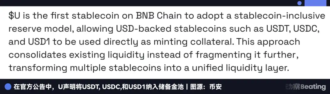 The design logic of $U is fundamentally different from the previous two: it does not directly compete with USDT, USDC, or USD1 but incorporates them all into its reserve pool. In a sense, $U is a "stablecoin of stablecoins" or a "stablecoin ETF."