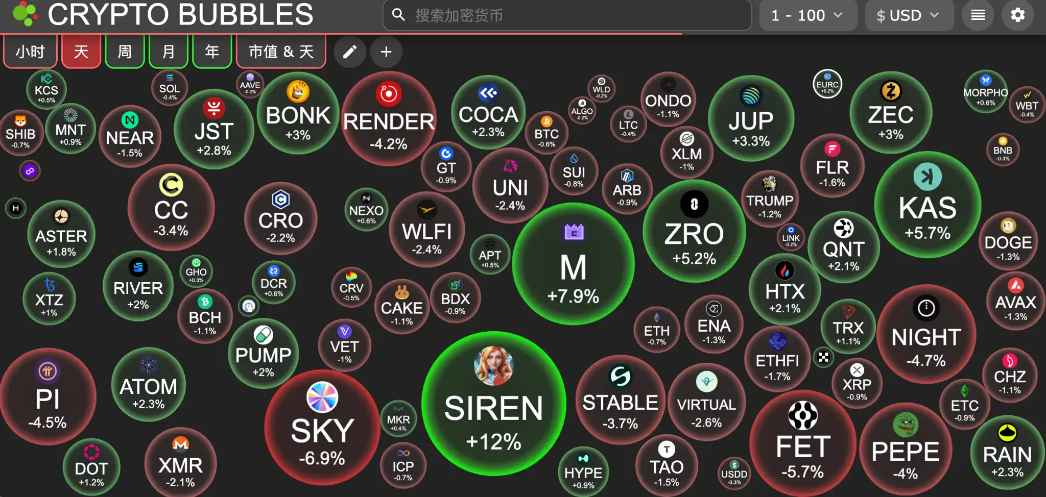 Today's Top 100 Coins by Maximum Gain: Siren up 12%, MemeCore up 7.9%, Kaspa up 5.7%, LayerZero up 5.2%, Jupiter up 3.3%.