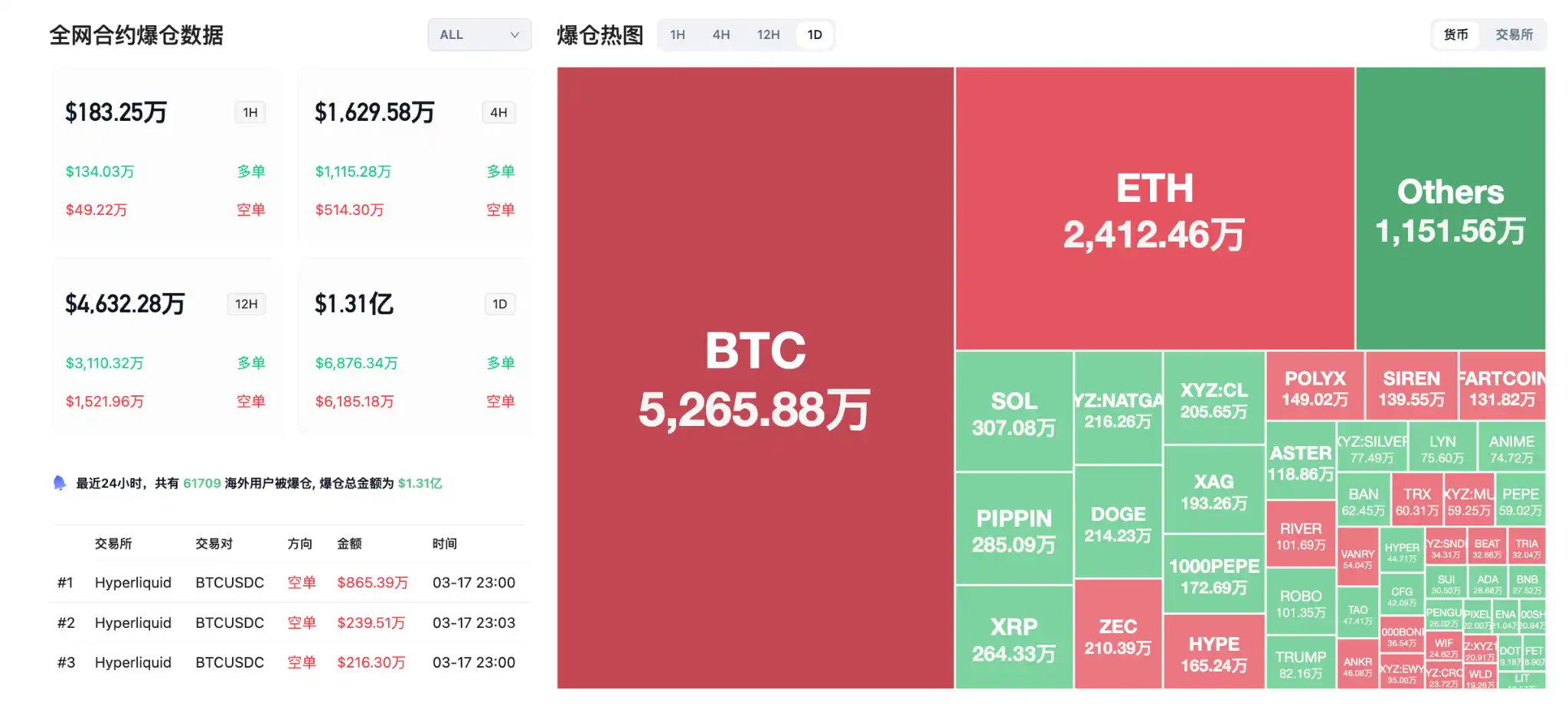 24-hour Liquidation Data: 61,709 people were liquidated globally, with a total liquidation amount of $131 million. BTC liquidations were $52.65 million, ETH $24.12 million, SOL $3.07 million.