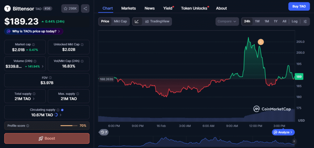 The early trading activities after the listing caused significant price movements for TAO. Currently, Tao is priced at $189.23. The token of Bittensor saw a strong rise in price after the announcement by Upbit as the local demand entered the market. The strong rise in price persisted in the following trading sessions as the liquidity expanded across the exchanges.