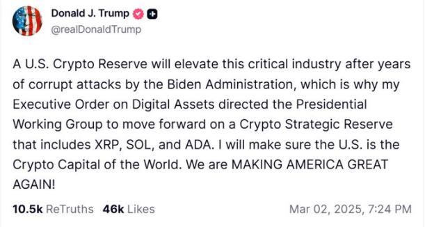 On March 6, Trump established the "Strategic Bitcoin Reserve" and the "U.S. Digital Asset Reserve" via executive orders. The Bitcoin Reserve contains only Bitcoin, while the Digital Asset Reserve includes various altcoins. Before the order was issued, Trump had stated that the reserve would include XRP, Solana, and Cardano.