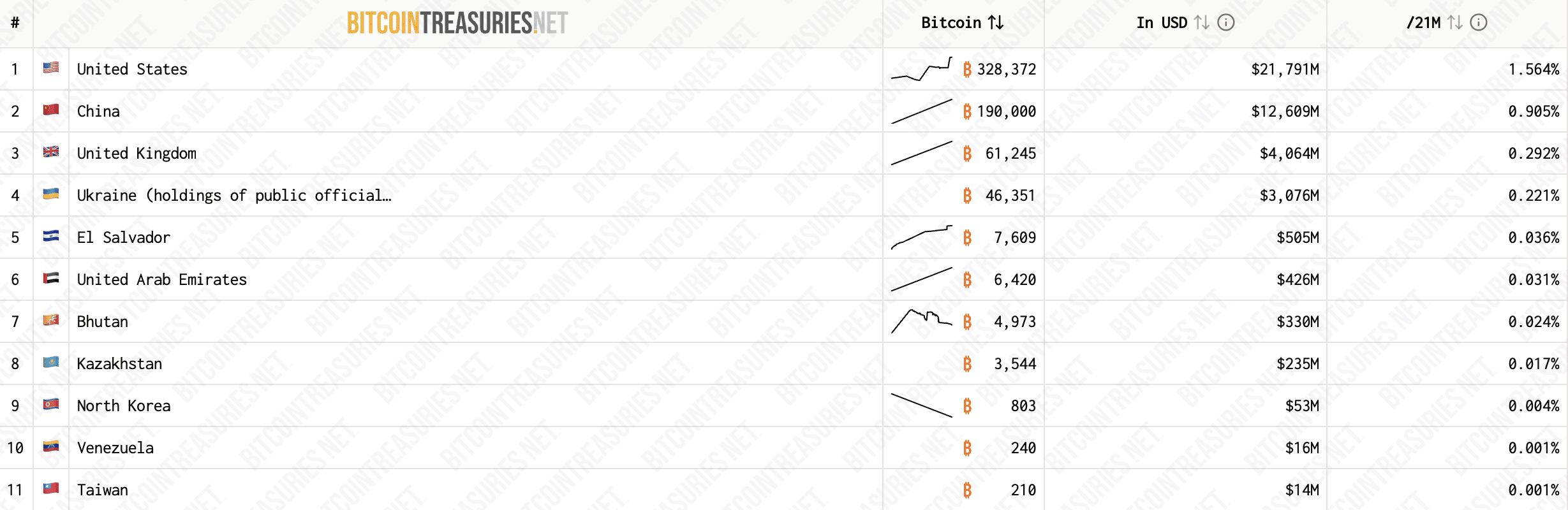 This comes as Taiwan’s Bitcoin stash stands at 210 BTC worth $14M, just 0.001% of the total Bitcoin supply as per BitcoinTreasuries.Net. Meanwhile, the U.S holds 328,372 BTC worth $21,822 million.