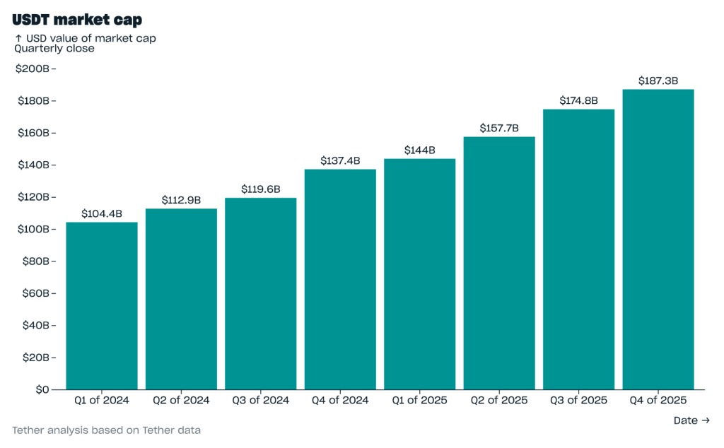 A new report from Tether shows USDT saw growth in several metrics during the last quarter of 2025, including a new record in transfer volume.