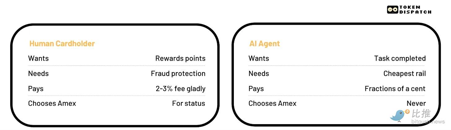 They don't accumulate points. They don't feel safer because of fraud protection. They don't aspire to a black card. They have only one instruction: complete the task. And when the task involves payment, the agent will do the math that humans can never be bothered to calculate—the cheapest path, the fastest settlement, the lowest fees. Every time, automatically, without any emotion.