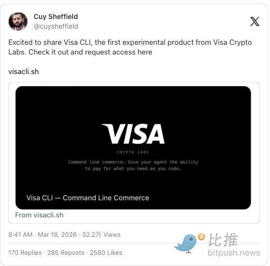 "Excited to share Visa CLI, the first experimental product from Visa Crypto Labs. Check it out and apply for access here: visacli.sh"