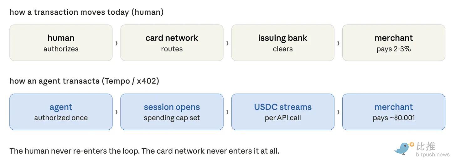 An agent completing a research task might call hundreds of specialized data APIs in one session. Each call costs just a fraction of a cent. Over a week, these calls might generate $40 in revenue for the service developer. Card networks cannot handle this kind of transaction—the minimum transaction cost (economic model) doesn't work, the merchant onboarding process doesn't work, the fee structure doesn't work. This type of commerce could never have run on Visa's rails from the start. It needs something entirely new, and x402, Nanopayments, and Tempo are building it.