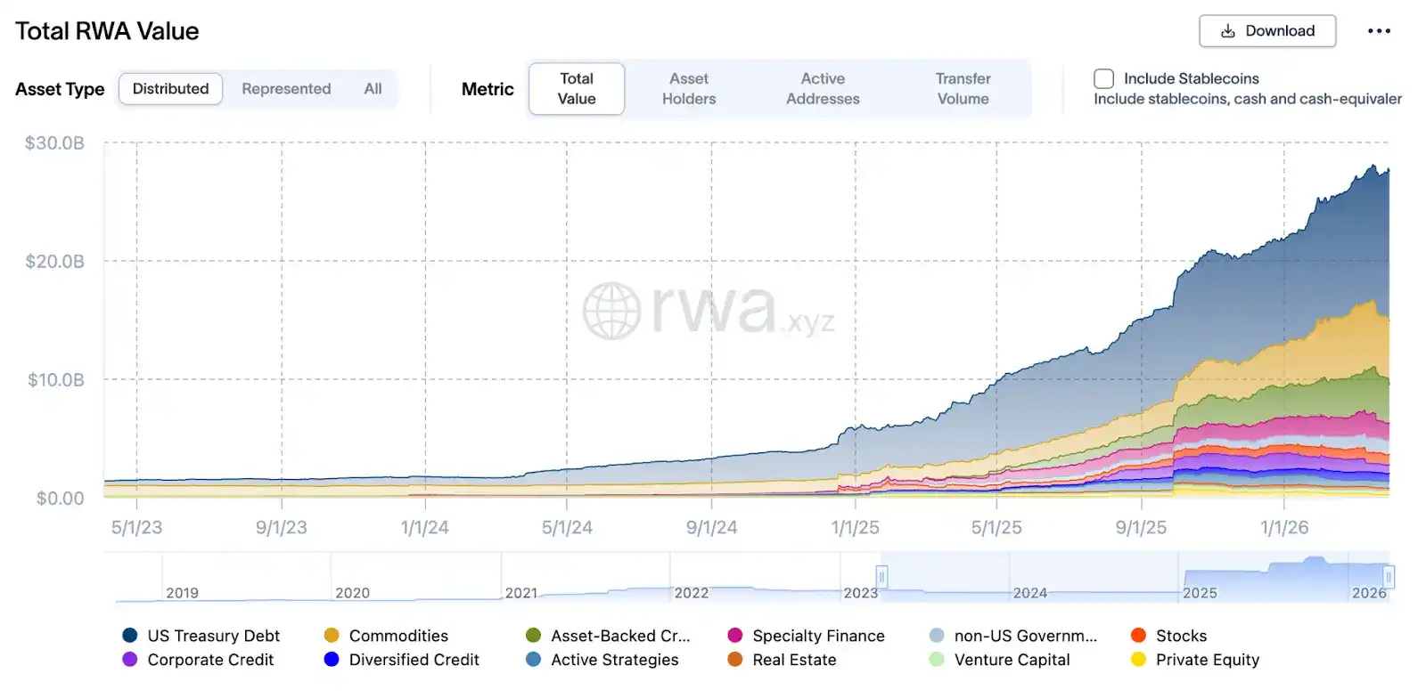 In this structure, the most crucial part is RWA: As of the end of March 2026, the total value of RWA had reached $27.5 billion, a growth of over 2.4 times compared to $8 billion in March 2025. These assets are primarily used by institutions as collateral for stablecoin loans through protocols like Aave Horizon, Maple Finance, and Centrifuge, forming an "on-chain repo (repurchase agreement)" re-collateralization flywheel.