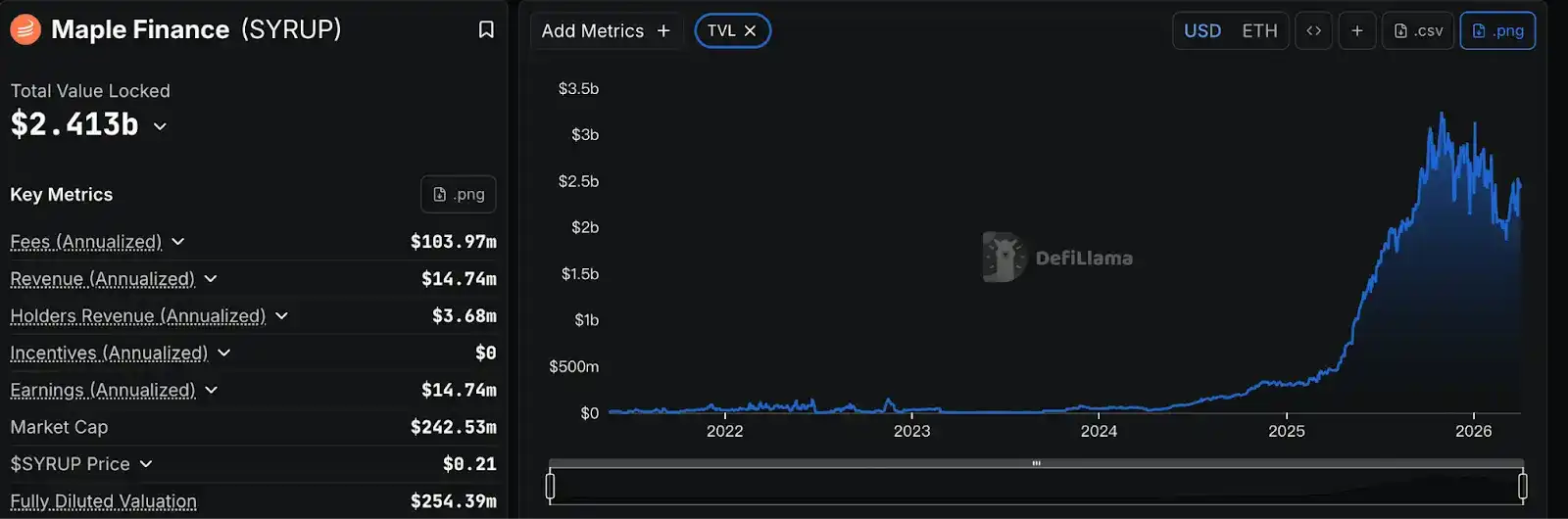 Maple Finance's TVL surged from $297 million in 2025 to over $3.1 billion, at times approaching $3.3 billion. The main driver was institutions entering the RWA lending market, tokenizing private loans and corporate loans for "over-the-counter" stablecoin lending and refinancing.