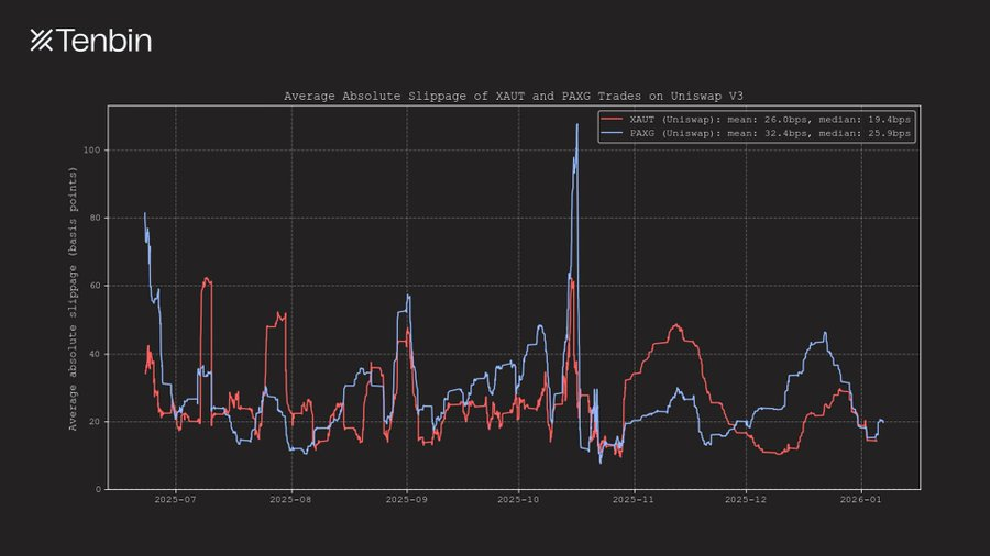 Furthermore, over the past six months or so, the average slippage for XAUT and PAXG trades on Uniswap has consistently remained in the range of 25–35 basis points, and even exceeded 50 basis points during certain periods.