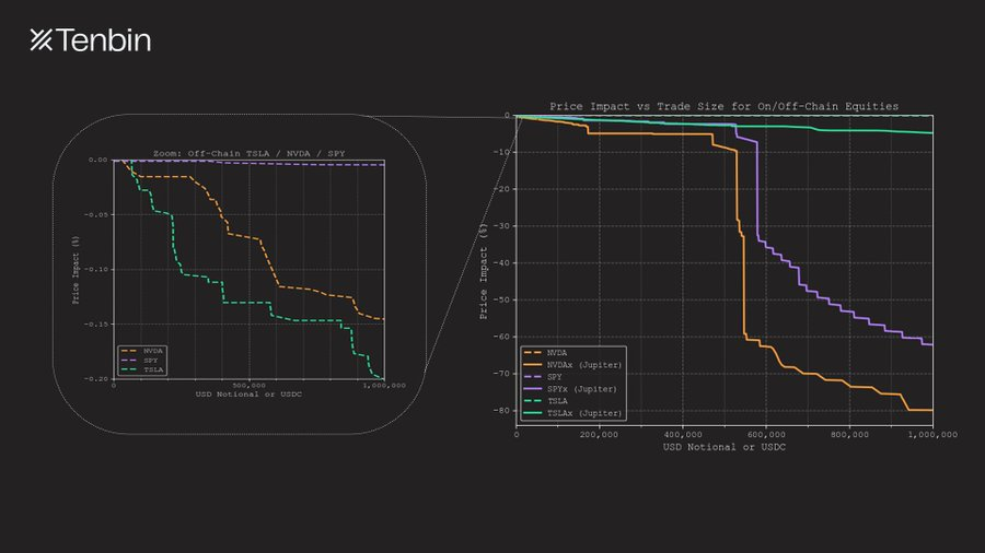 TSLAx and NVDAx are among the top tokenized stocks by market cap. On Jupiter, a $1 million TSLAx trade has a slippage of about 5%; while NVDAx's slippage is as high as 80%,几乎失去可交易性. In contrast, in traditional markets, a trade of the same size in Tesla or Nvidia stock has a price impact of only 18 basis points and 14 basis points respectively (this doesn't even include off-exchange liquidity like dark pools).