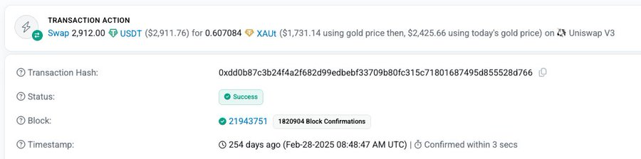 For example, in a February 2025 XAUT transaction, a user spent 2,912 USDT but only received XAUT worth approximately $1,731 at the real gold price at the time, effectively paying a premium of up to 68% for this trade.