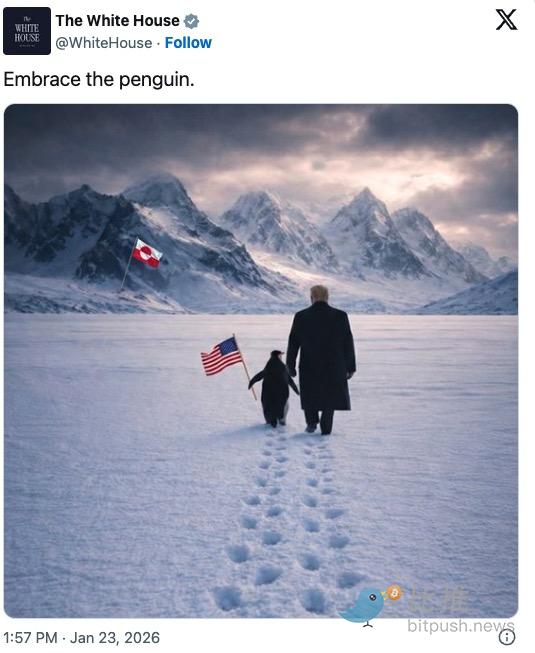 So, when the official White House account combined this image with Trump—depicting the two walking side by side towards the mountains of Greenland—the originally nihilistic "lonely journey" was instantly reshaped into a heroic远征 (expedition) of "Americans know what they are fighting for."