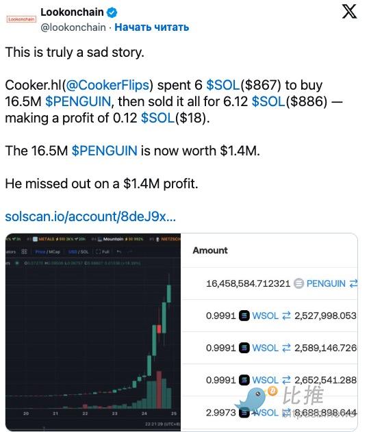Another on-chain "unlucky guy" bought 16.5 million PENGUIN for just 6 SOL (approx. $867) very early on, but exited hastily with a small profit (6.12 SOL) before the rally began. Had he held on, that asset would have been worth over $1.4 million at its peak.