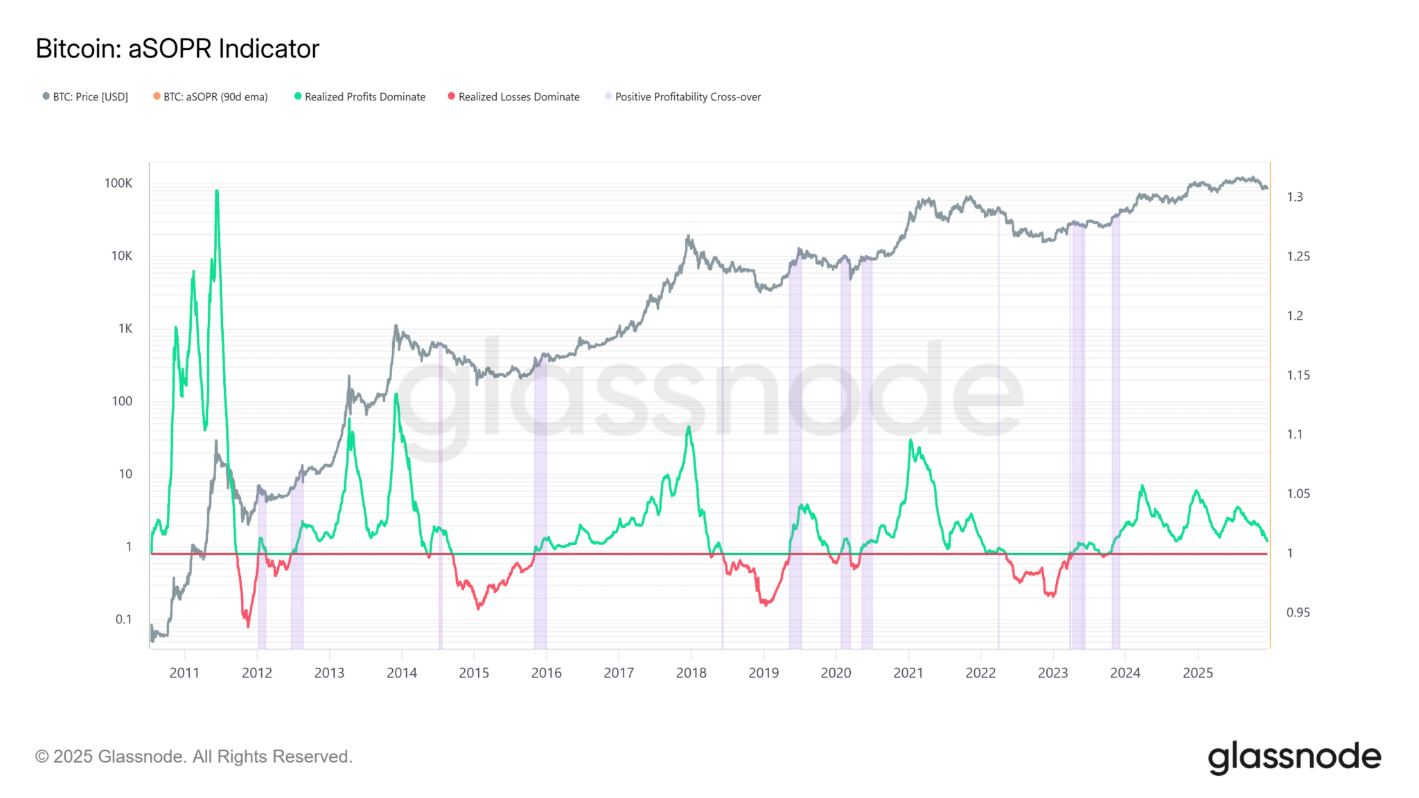 The extended correction below $100k in mid-November pushed price action below this key bull market support. Unless reclaimed, the bullish uptrend could be at risk.