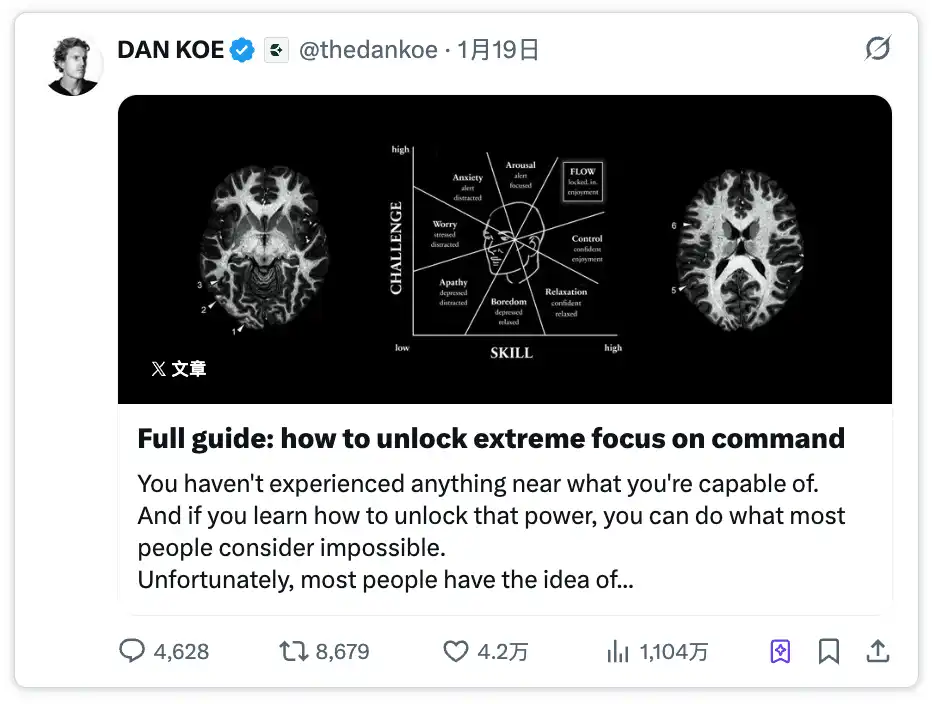 Dan Koe's参赛文章 (contest entry) "How to Enter a State of Deep Focus Anytime" received 42,000 likes, 8,681 reposts, the highest interaction data among all entries. But the exposure was only 11.04 million, less than a quarter of the champion's.