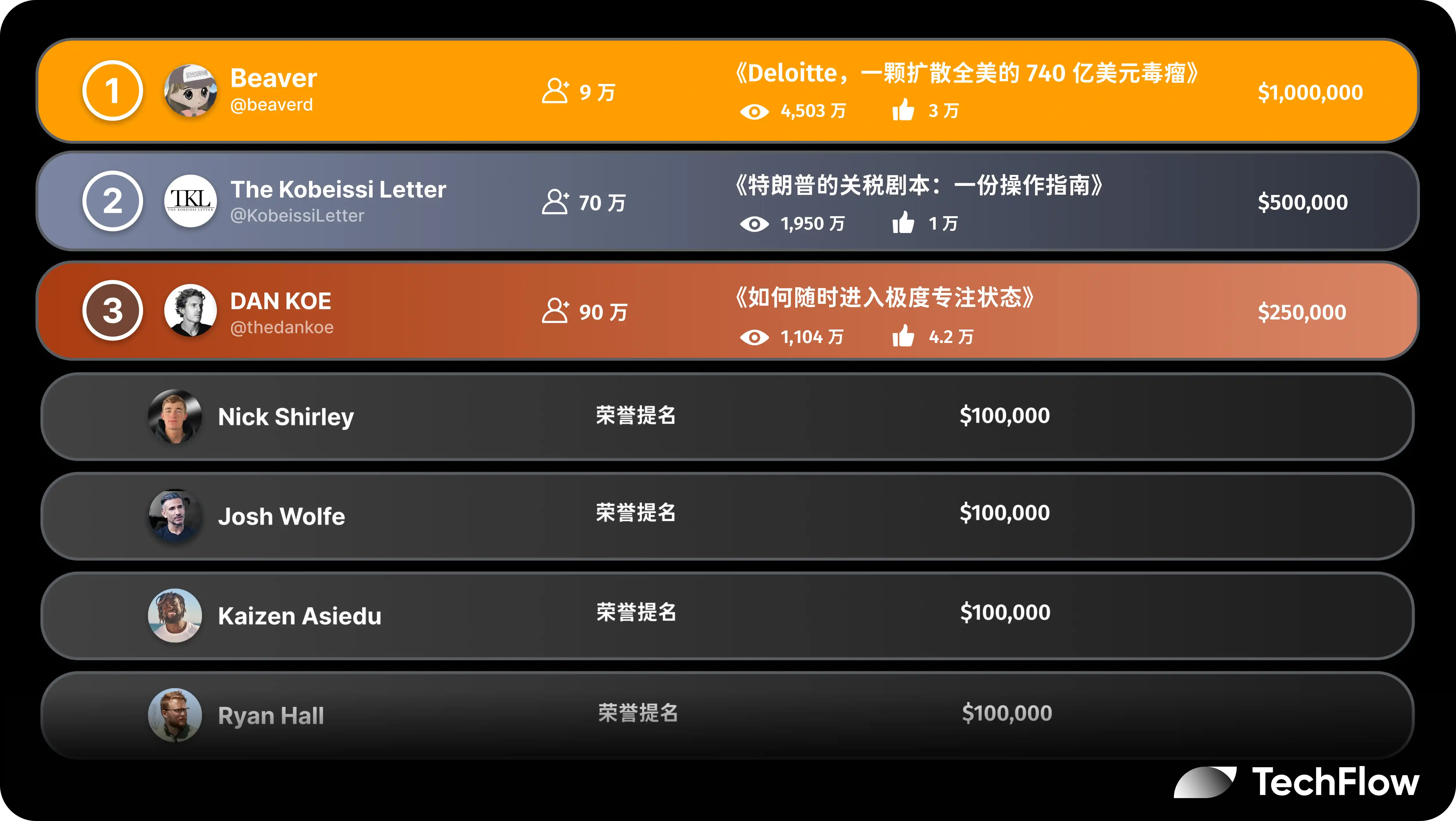 Champion @beaverd had 90k followers before the competition. Runner-up @KobeissiLetter had 700k followers. Dan Koe had 900k followers.
