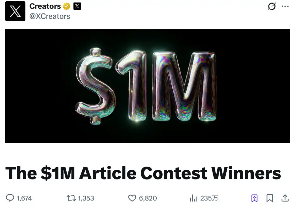 X clearly saw the traffic potential of long-form content and quickly followed up: lowering the threshold for the Articles feature, adjusting the algorithm to prioritize long-form content over short posts, and announcing the million-dollar征文大奖 (essay contest大奖).