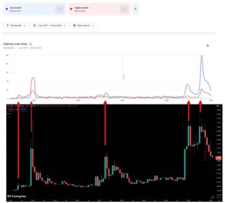 It is well-known that bullish interest in XRP often rises during major price moves. However, a new analysis suggests that Google search data shows that scam-related queries for the cryptocurrency also surge during periods of rapid growth. A crypto analyst has highlighted that this unique trend appears repeatedly across XRP’s major market rallies.
