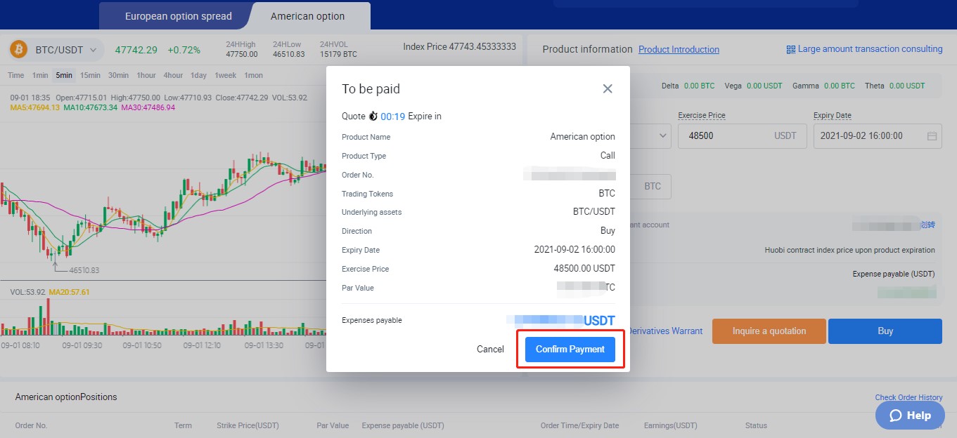 Bevestig de bestelinformatie van de optieovereenkomst, zoals de onderliggende activa, de hoeveelheid, de uitoefenprijs, de breakevenprijs en de premie. De premie is de kosten voor de aankoop van de optieovereenkomst. Klik op Bevestigen om de optiepremie te betalen. Na het betalen van de premie wordt het overeenkomstige bedrag van de optieaccount afgetrokken. Op dezelfde tijd berekent het systeem de breakevenprijs van de optieovereenkomst. Voor een calloptie kan opbrengst worden gemaakt als de onderliggende prijs boven de breakevenprijs stijgt. Voor een putoptie kan opbrengst worden gemaakt als de onderliggende prijs onder de breakevenprijs daalt. Gebruikers kunnen vooraf opties uitoefenen om opbrengsten vast te zetten op grond van de breakevenprijs.