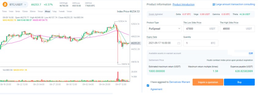 Klant B heeft een tegenovergestelde uitzicht en gelooft dat "de BTC-prijs in twee dagen licht zal stijgen en binnen twee dagen tussen 47.000 en 48.000 zal blijven", dus koopt hij/zij een Europese callspread van 47000-48000 die over twee dagen over de datum zijn (zoals omschreven in de onderstaande afbeelding), met de optiepremie van 194,63 USDT. Als de inschatting juist is, is de maximale opbrengst 1000 USDT.
