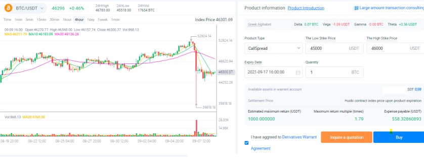 De BTC/USDT overeenkomstindexprijs is US$46.300. Klant C is negatief op BTC en gelooft dat "het over vijf dagen een zijwaartse markt zal zijn", dus koopt hij/zij de 45.000-46.000 Europese callspread die over vijf dagen over de datum zijn. Tegelijkertijd koopt hij/zij de 47.000-48.000 Europese putspread die over vijf dagen over de datum zijn, met een optiekosten van 1.180 USDT. Als de inschatting juist is en de prijs tussen 46.000-47.000 ligt op de vervaldatum, is het maximale rendement 2.000USDT (nettoopbrengst van 820USDT). Als hij niet binnen dat bereik zit, zal hij/zij minimaal 1.000 USDT verdienen, een verlies van 180 USDT.