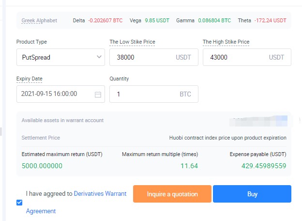 Klant B heeft een tegenovergestelde uitzicht en gelooft dat "het lager zal zijn dan 43.000 maar hoger dan 38.000" binnen twee dagen, dus koopt hij / zij een Europese putspread van 43.000-38000 die over twee dagen over twee datum zijn (zoals weergegeven in de onderstaande afbeelding), met de optiepremie van 429,45 USDT. Als de inschatting juist is, is de maximale opbrengst 5.000 USDT.