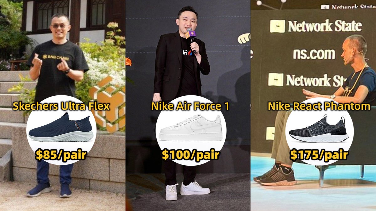 据 @CryptoDoggyCN 盘点,CZ 日常穿搭为斯凯奇一脚蹬,售价约 $85。CZ 本人回应称该鞋“高效、简单、舒服、便宜”,并表示是在亚马逊购买的,自己不懂衣服。孙宇晨偏爱 Nike Air Force 1,体现 80、90 后男性的共同印记,售价约 $100;Vitalik 则穿 Nike React Phantom 跑鞋,售价约 $175。