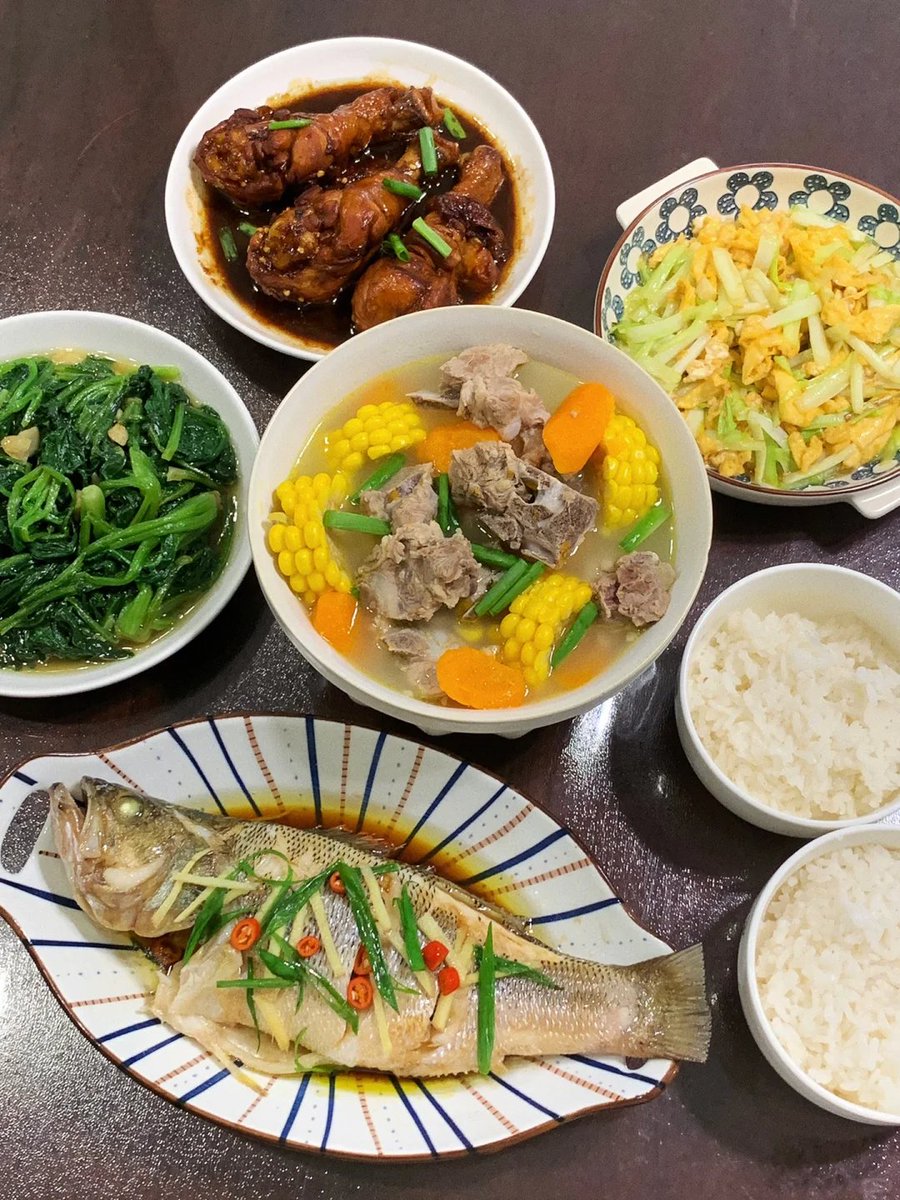 -玉米排骨汤 -葱油鲈鱼 -红烧鸡腿 -韭黄炒鸡蛋 -蒜蓉菠菜