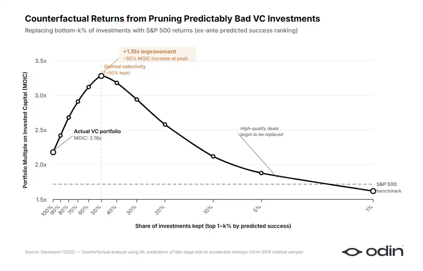 Davenport 在超过 16000 家创业公司的数据集上构建了机器学习模型,代表超 90 亿美元的承诺资本。他只用投资人决策时可用的信息训练模型,并问:风险投资人实际做出的投资中,有多少可以在事前被识别为不如把同样的钱投入标准公开市场替代品?答案是大约一半。