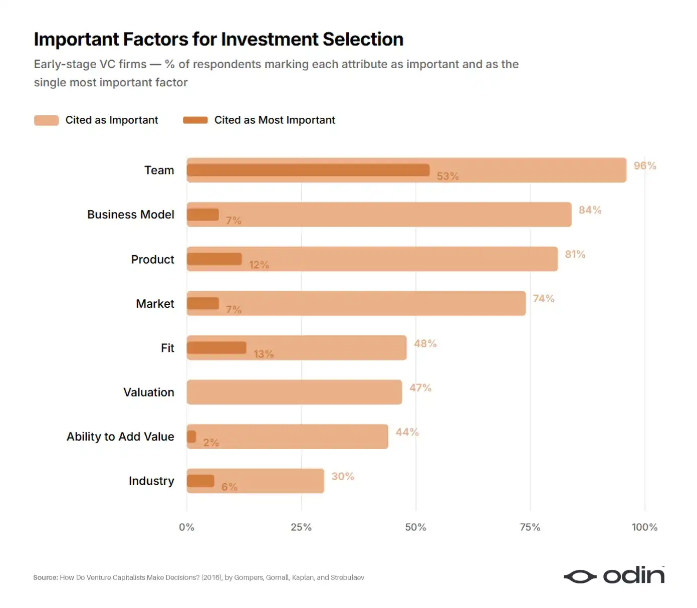 约 53%的早期受访者将创始人列为交易选择中最重要的单一因素。商业模式和产品(Perkins 的传统领域)被约 10%的人选择。市场和行业(Valentine 的关注点)被约 6%选择。其余分散在估值、与基金的契合度以及投资者自身增值能力上。
