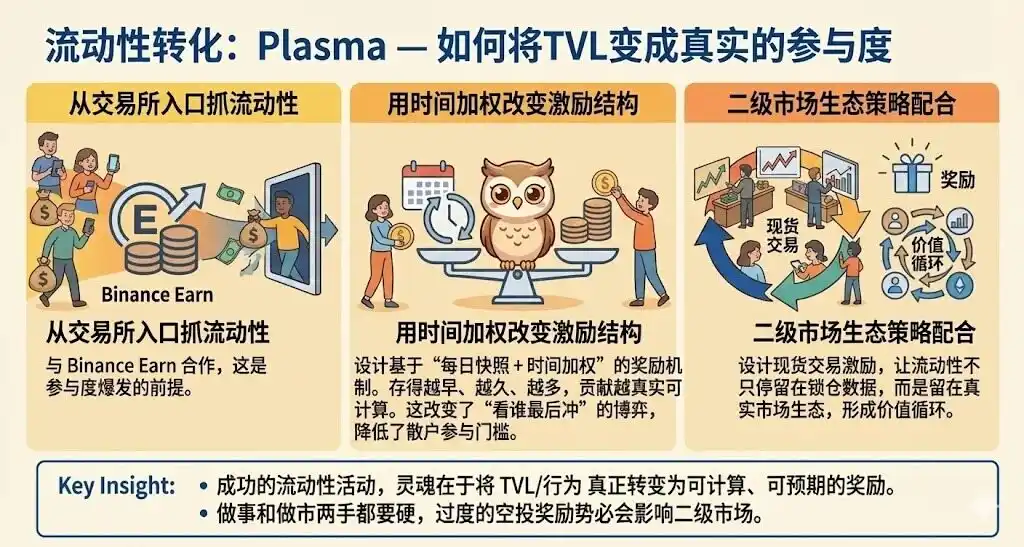 Plasma's strategy出发点 was to attract users by promoting stablecoin continuous存量 behavior in the ecosystem. Plasma cooperated with Binance Earn to launch an on-chain USDT yield product. Users who participated in Plasma's USD₮定期锁仓 could enter the $XPL airdrop range. This design is not one-time but is based on a daily snapshot + time-weighted持仓累积奖励机制. Longer holding periods and higher持仓都会放大最终的 XPL reward.