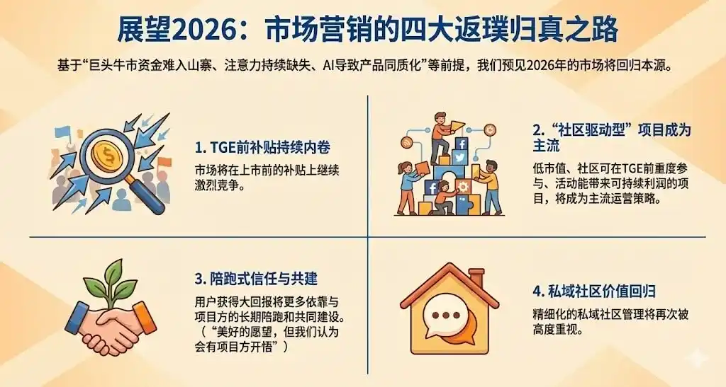 My premise for thinking about 2026 marketing trends: A bull market driven by countries and traditional capital giants will be difficult to enter the山寨 market; attention will be more lacking, and the ROI of marketing只关注公域流量 will无限接近负数; the AI era makes it harder for projects to拉开差距 from technology and products, and the "全民创作者" homogenized content on X will make users gradually lose interest; more open regulation催生 more competition for attention in other public and private domains.