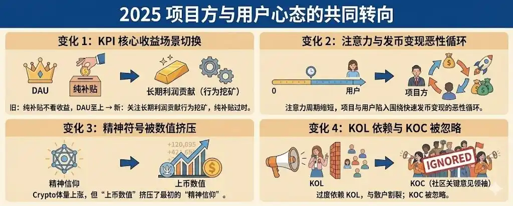 - Summarize the共同转向 of project teams and user mindsets in 2025: users value certainty and兑现able returns more, project teams treat market activities more as tools to obtain liquidity, trading users, and pre-listing momentum, while attention cycles shorten, post-TGE空心化 expands, and culture and community management are chronically underestimated.