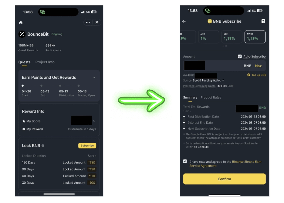 Now that your account is ready, the first thing you can do is navigate to the Megadrop section and lock your BNB to earn scores. From there, you can subscribe to your BNB and lock it for a certain period of time, thus earning a score.