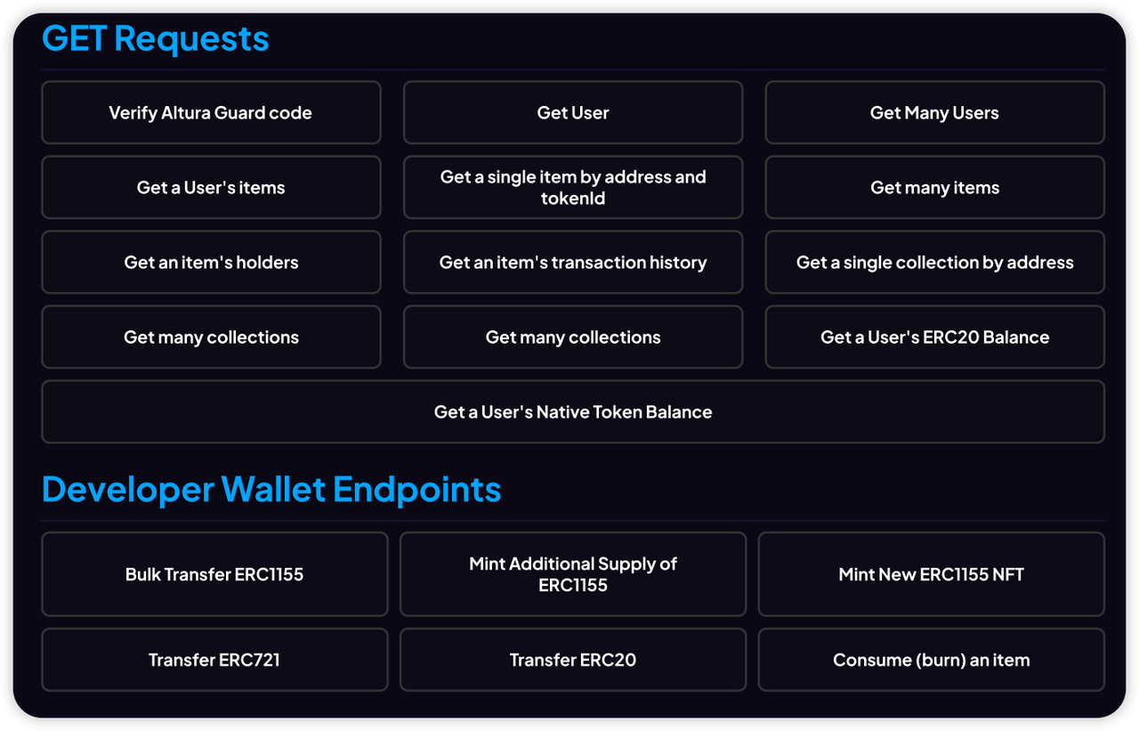 2. Integrating SDKs: Use JS/TS SDK or Unity SDK to interact with Altura’s services for user authentication, data retrieval, and NFT management.