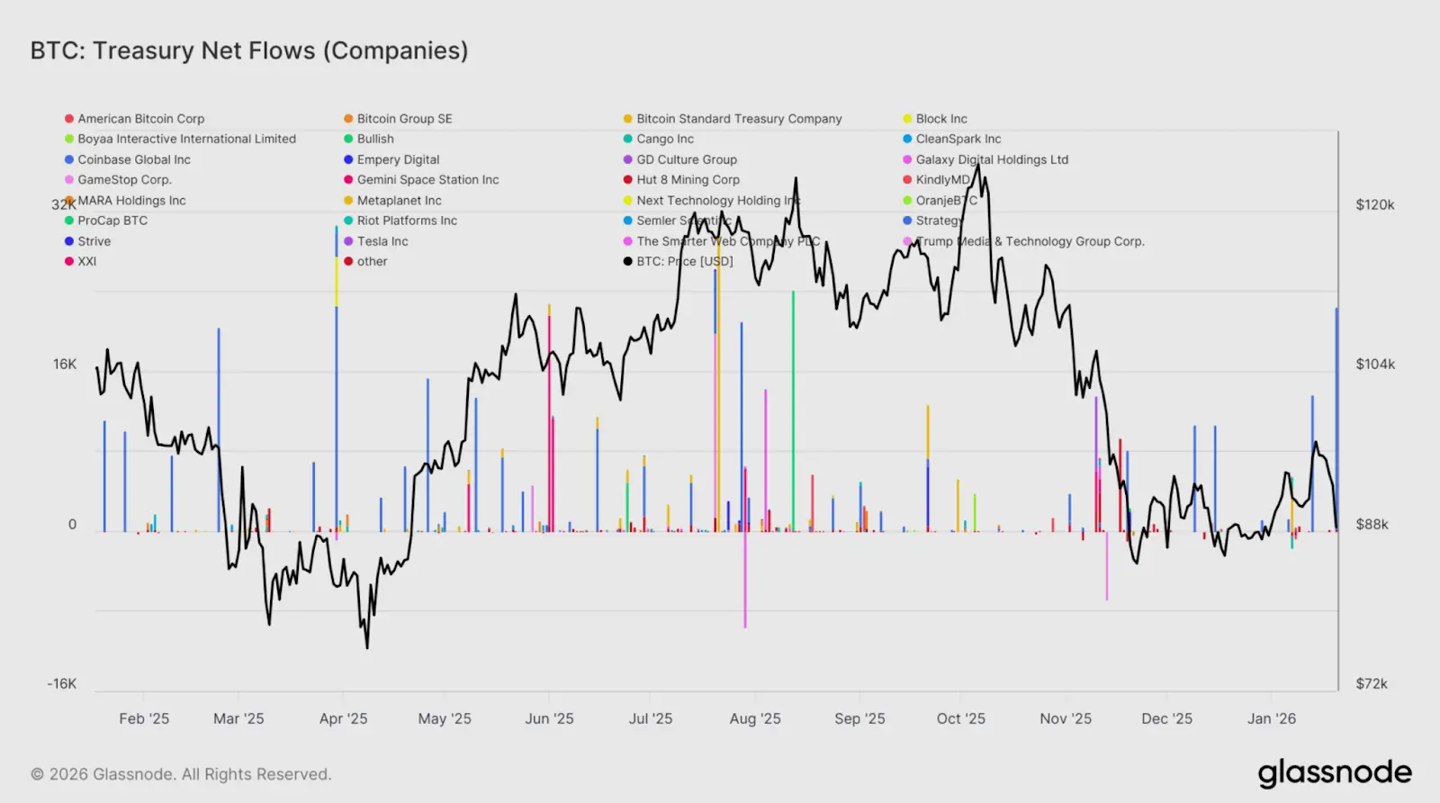 Sporadic and Uneven Inflows into Bitcoin Treasuries: A Glassnode report points out that recent corporate inflows have been concentrated in individual event-driven trades rather than widespread accumulation. The chart below shows that the buying is primarily driven by MicroStrategy, while other Bitcoin treasury companies have not made further purchases recently, contrasting sharply with the boom from May to August 2025 when multiple treasury companies bought collaboratively, accelerating the trend.