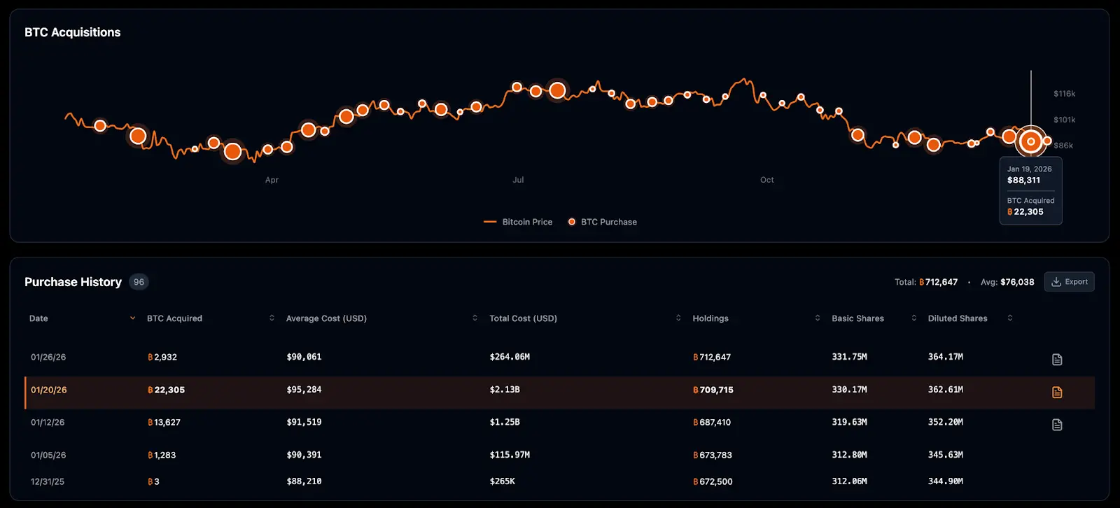 According to data from Bitcoin Strategy Tracker, MicroStrategy purchased over 40,000 Bitcoins in January 2026 alone. Particularly, between January 6 and January 20, it bought 35,932 Bitcoins in two batches, with an average purchase price ranging from $91,500 to $95,300. Statistics show that MicroStrategy's total investment in January reached $3.7 billion; as of January 27, its balance sheet held 712,647 Bitcoins, with an overall average purchase cost of $76,038.