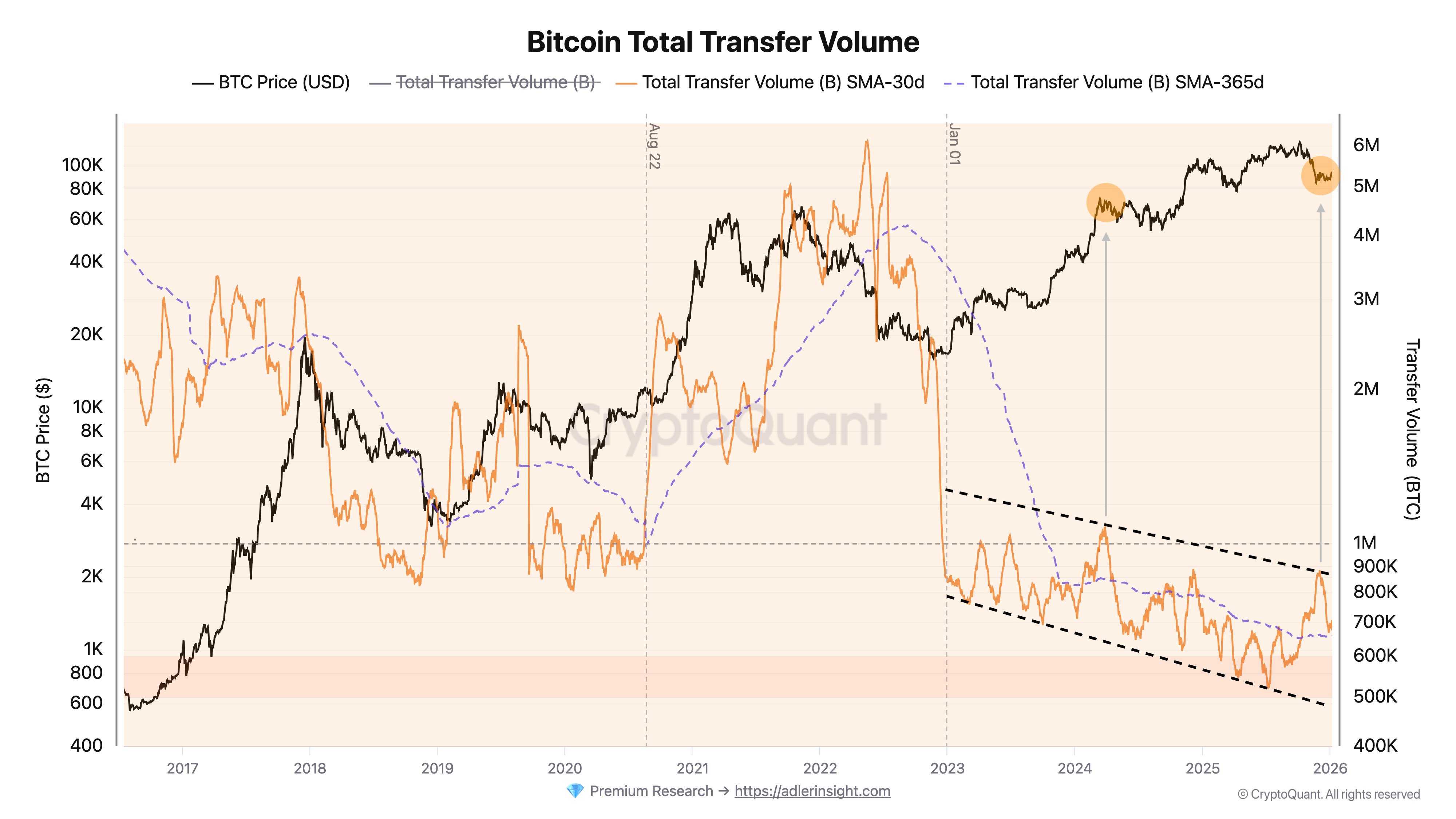 Data shows the Bitcoin transfer volume has been following a long-term decline, suggesting network activity has been shrinking despite price growth.