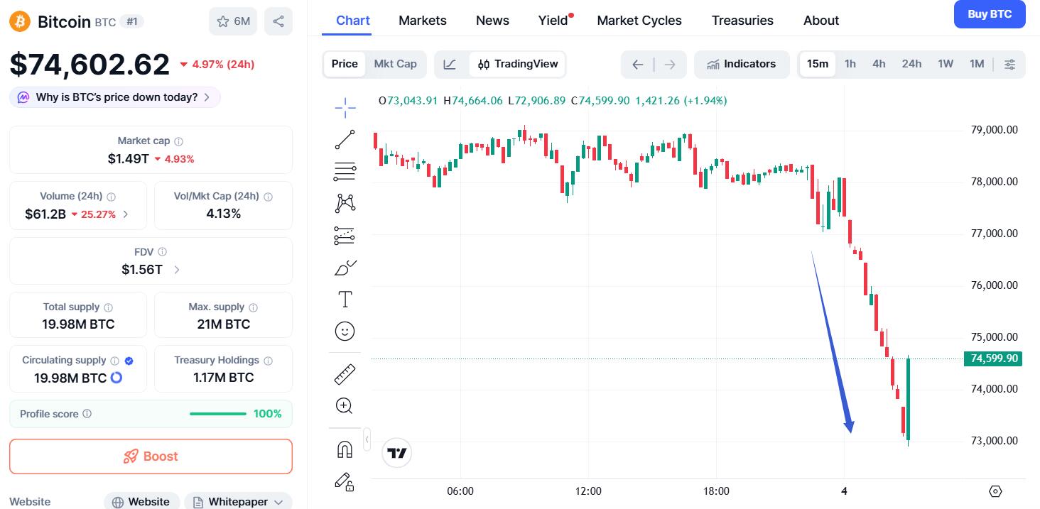 Data from CoinMarketCap showed a broad acceleration in the sell-off across cryptocurrencies during Tuesday's U.S. midday trading. Bitcoin once fell below $73,000, dropping more than $6,000, or nearly 8%, from its intraday high above $79,100 reached in the early Asian session, hitting its lowest level since early November 2024, after Trump's election victory.