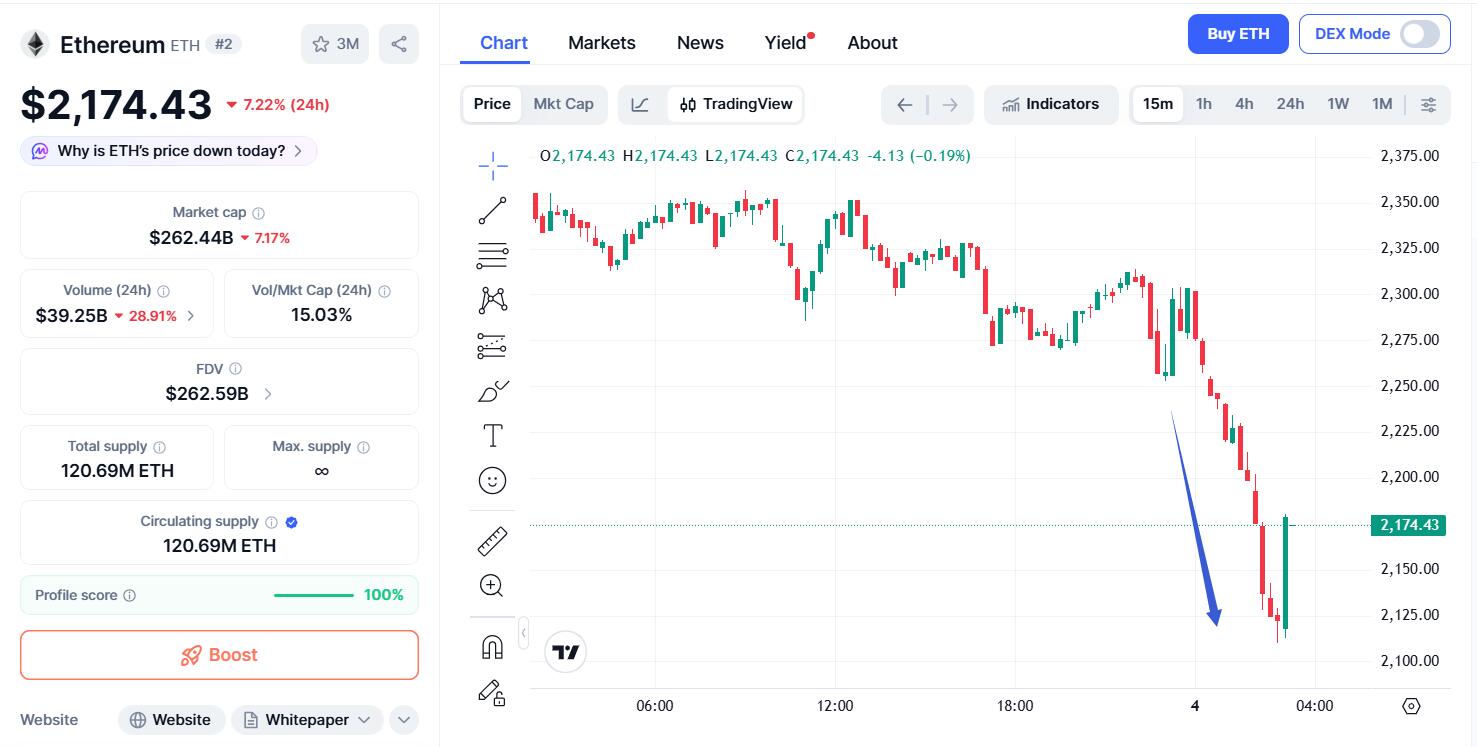 Ethereum, the second-largest cryptocurrency by market cap, saw an even steeper decline. It once fell below $2,110 during U.S. midday trading, hitting its lowest level since May 2025, down just over 10% from its daily high above $2,350 in the early Asian session.