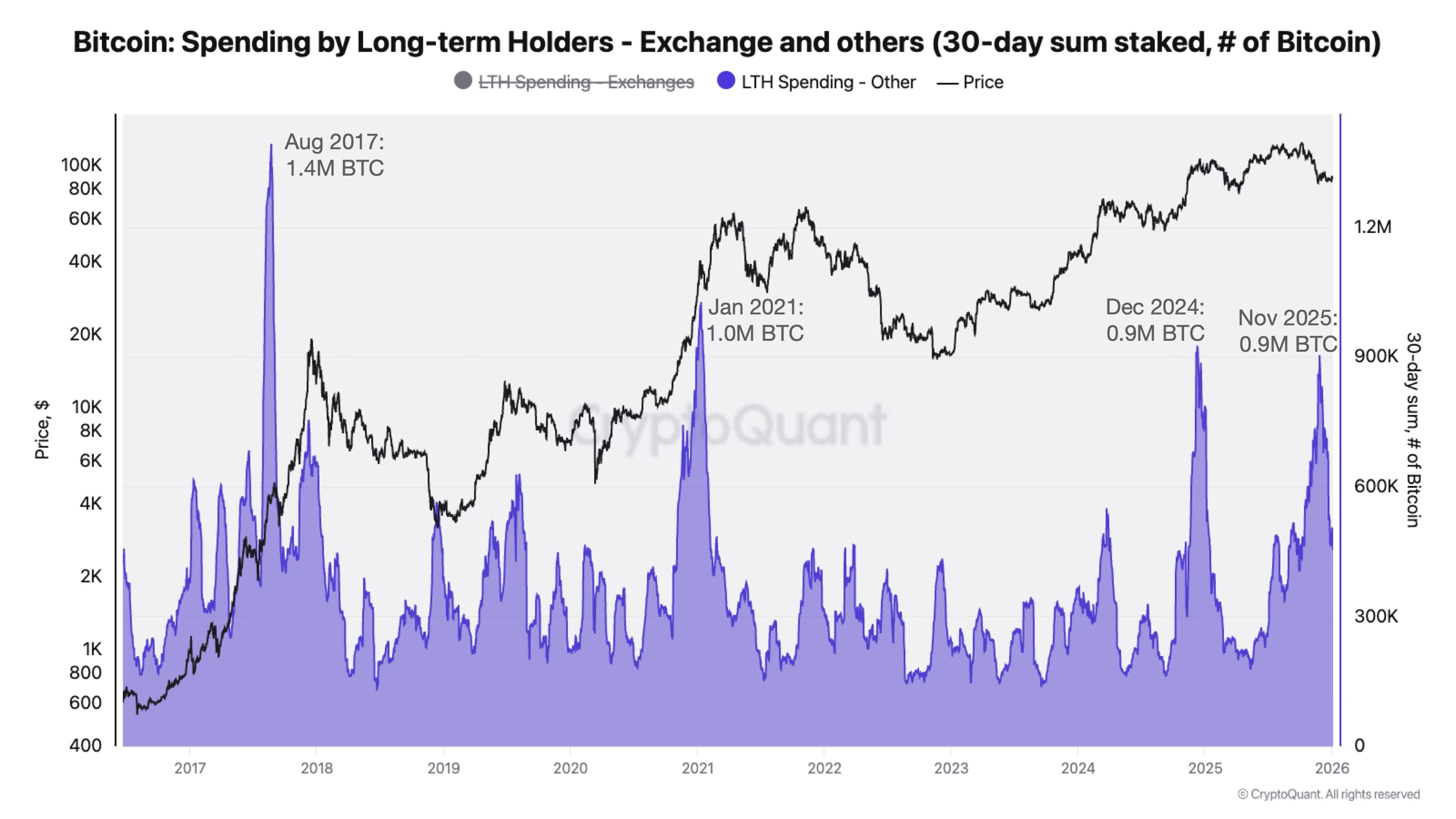 At the height of the Bitcoin LTH distribution in November, the 30-day sum of spending hit a record high of 1.55 million BTC. The analyst has pointed out, however, that this figure doesn’t tell the entire story.