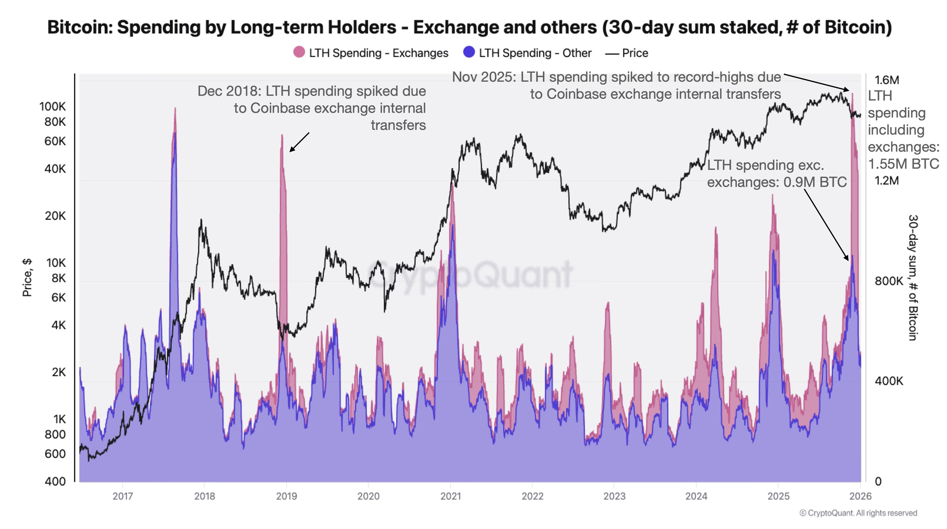 While adjusting for internal Coinbase shuffling lessens the scale of the latest diamond hand selloff, it doesn’t quite eliminate it. The monthly LTH spending still hit a notable level of 0.9 million BTC at the peak in November.