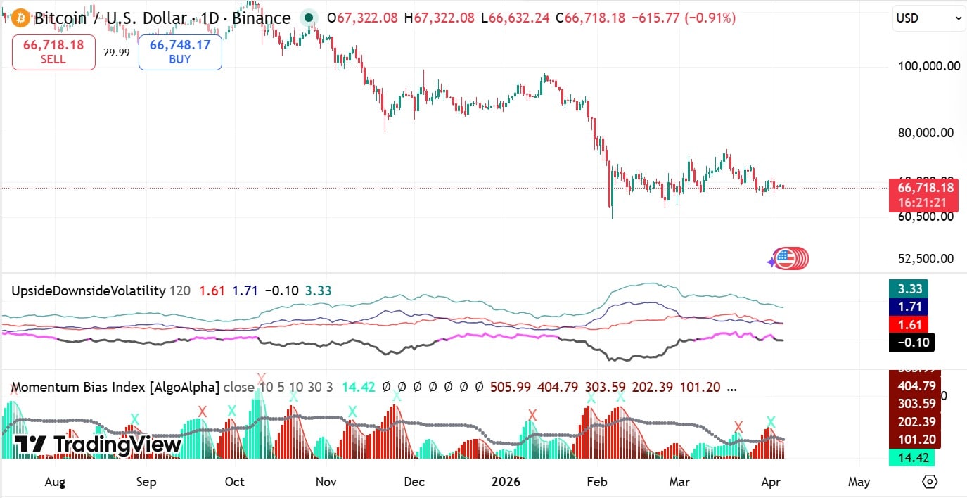 Bitcoin (BTC) has been in a prolonged downtrend since its peak of $126k in October 2025, falling below the Short-Term Holder (STH) Realized Price and leaving over 45.8% of the total supply at a loss. In Q1 2026, investors holding 100 to 10,000 BTC realized $30.9 billion in losses, with whales accounting for $337 million in daily losses—the highest rate since the 2022 bear market. Long-term holders contributed approximately $200 million in daily losses. This aggressive loss realization suggests the market is not yet at a cycle bottom, as historical lows formed when daily losses cooled to around $25 million. Current market conditions indicate indecision, with upside volatility at 1.9 and downside volatility at 1.6. If loss realization continues and demand weakens, BTC could drop to $62,500. Otherwise, it may continue consolidating between $65k and $70k.