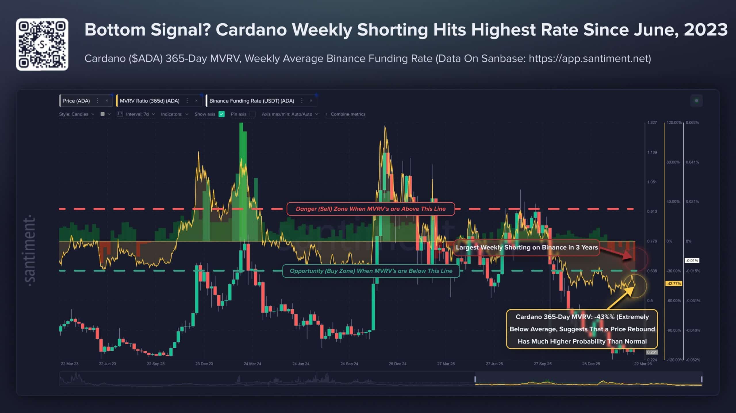 In a post on X, Santiment explained why Cardano was flashing bottom signals. The 365-day MVRV was at -43% and deep within a buy zone. Cardano has shed 71% in value since September 2025.