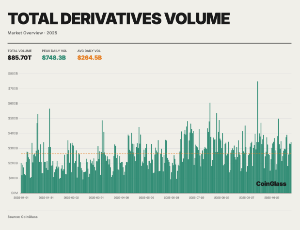 According to a report by liquidation tracker CoinGlass, cryptocurrency derivatives trading hit roughly $85.7 trillion in 2025, an average of about $264 billion a day. That surge put derivatives back at the center of crypto activity and left a clear imprint on markets worldwide.